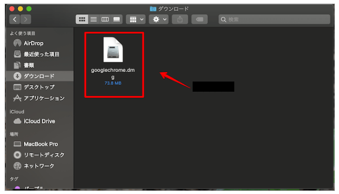 ⑤ゴミ箱の左側にダウンロード済みのものが表示されます。その中の「googlechrome.dmg」をクリックします。