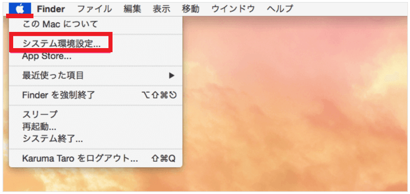 ①左上のリンゴのアイコンをクリックし、その中の[システム環境設定]をクリックします。