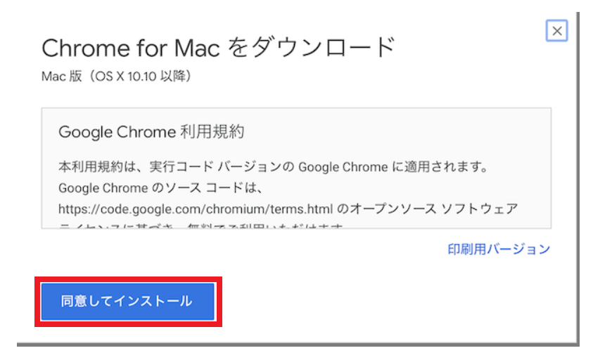 ③「Chrome for Macをダウンロード」という画面が表示されますので、利用規約を確認し、[同意してインストール]をクリックします。