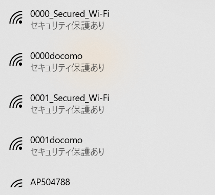 フリーWi-Fiが使えるお店や施設に入ると、下記画像のように使用できるWi-Fiがたくさん出てきます。